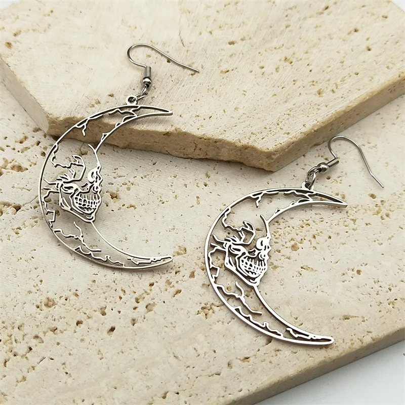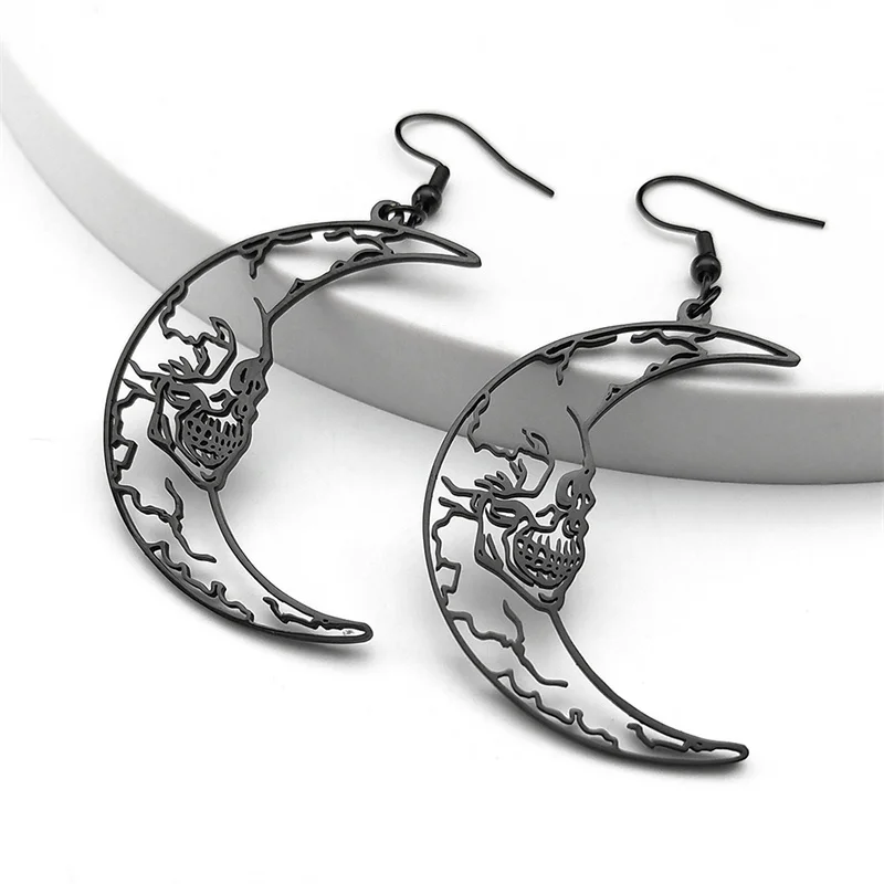 Earrings: Gothic Skull Witchcraft Crescent Moon Stainless Steel Hoop Earring