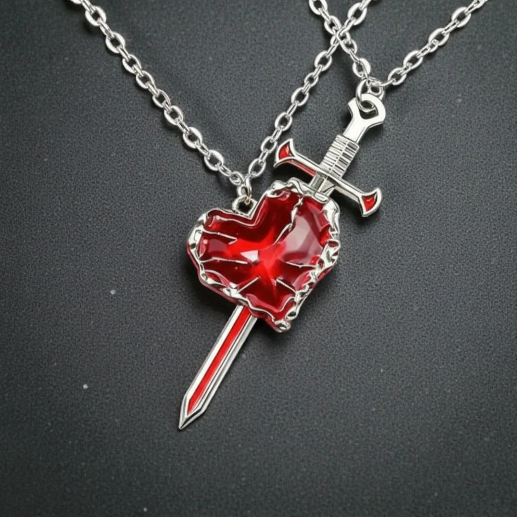 Um pingente de espada e um pingente de coração escarlate, feitos para se encaixar um no outro — formando a união que só existe quando duas almas se encontram.